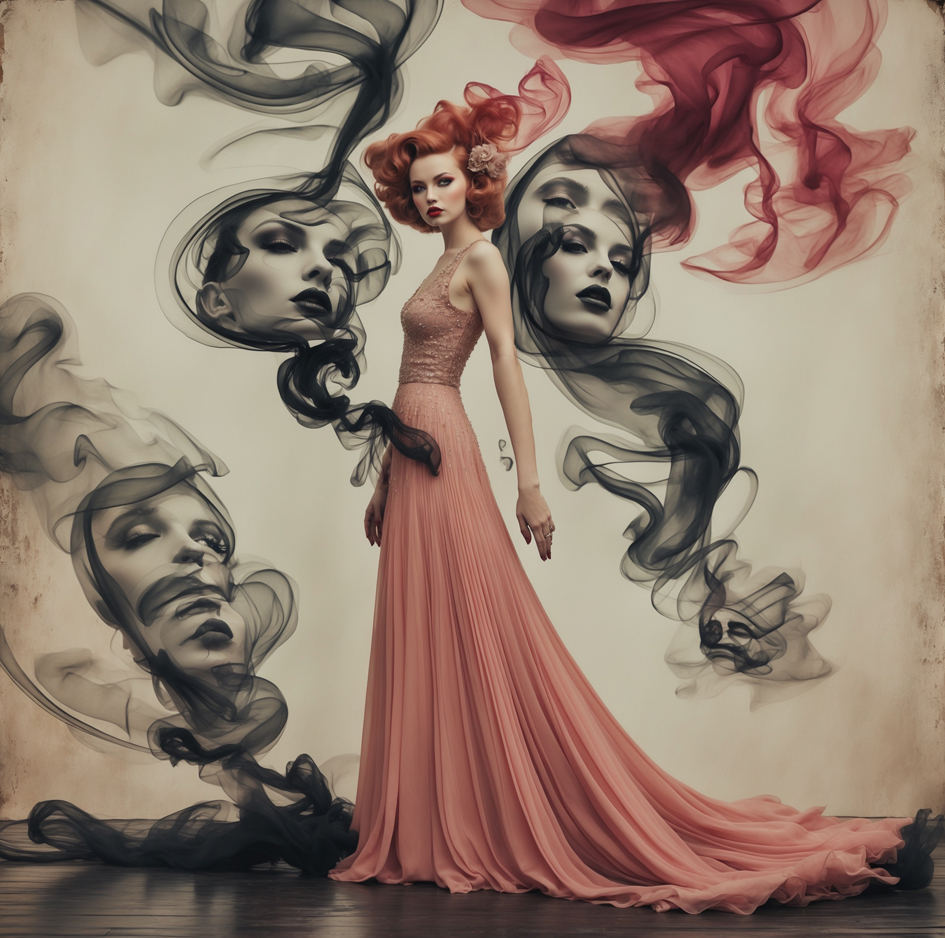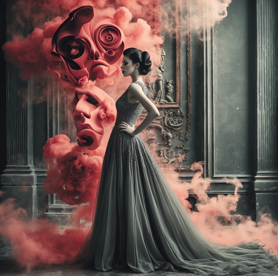 Die Serie verbindet Mode und Metapher: Kleider werden zu Bühnenbildern, Rauch zu bewegter Skulptur, und Masken zu Symbolen der vielen Gesichter, die wir tragen. Zwischen Eleganz und Illusion entfaltet sich eine Modeperformance, die wie ein visuelles Gedicht über Identität, Rollen und das Geheimnis der Selbstdarstellung wirkt.