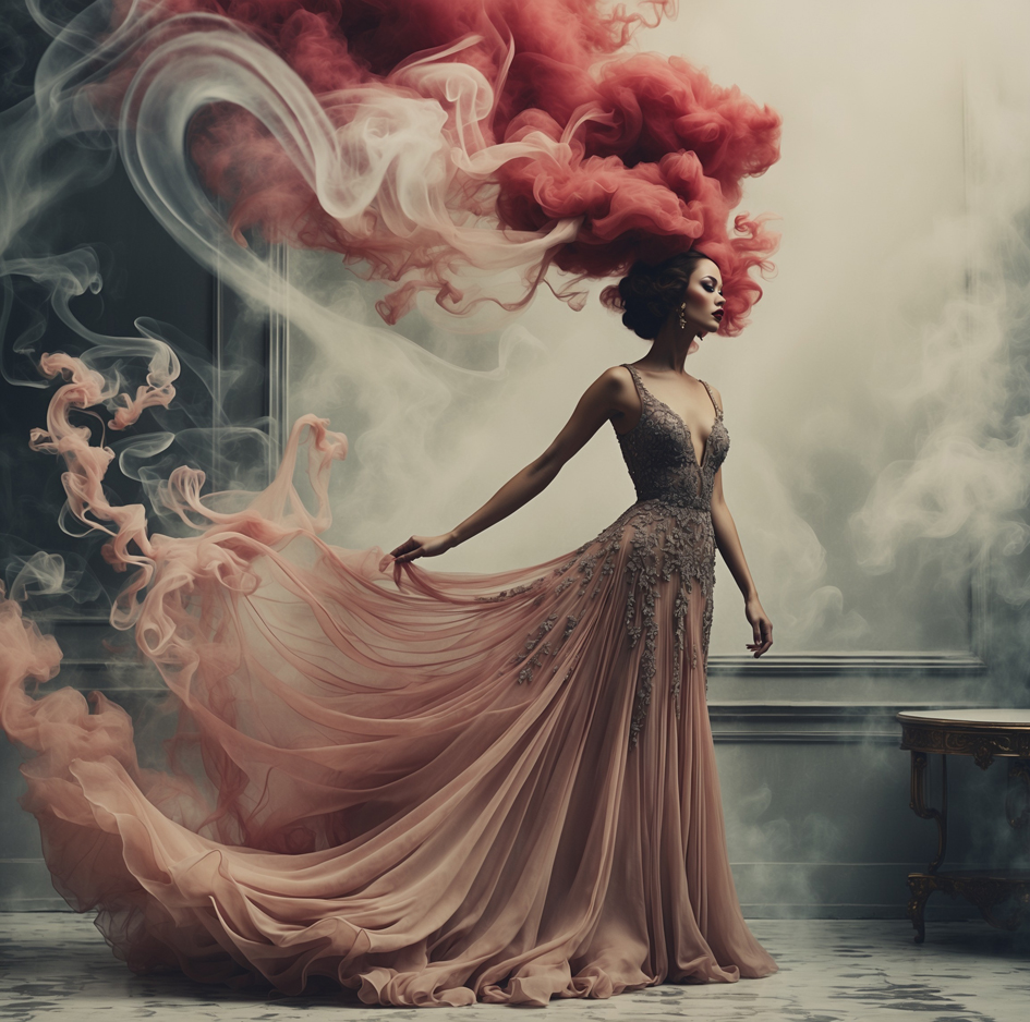 Diese Bildreihe inszeniert Mode als Bühne des Selbst: Rauch wird zum Ausdruck flüchtiger Emotionen, Masken spiegeln die Vielschichtigkeit der Identität. Couture verwandelt sich hier in eine poetische Allegorie zwischen Sichtbarkeit und Verbergen.“