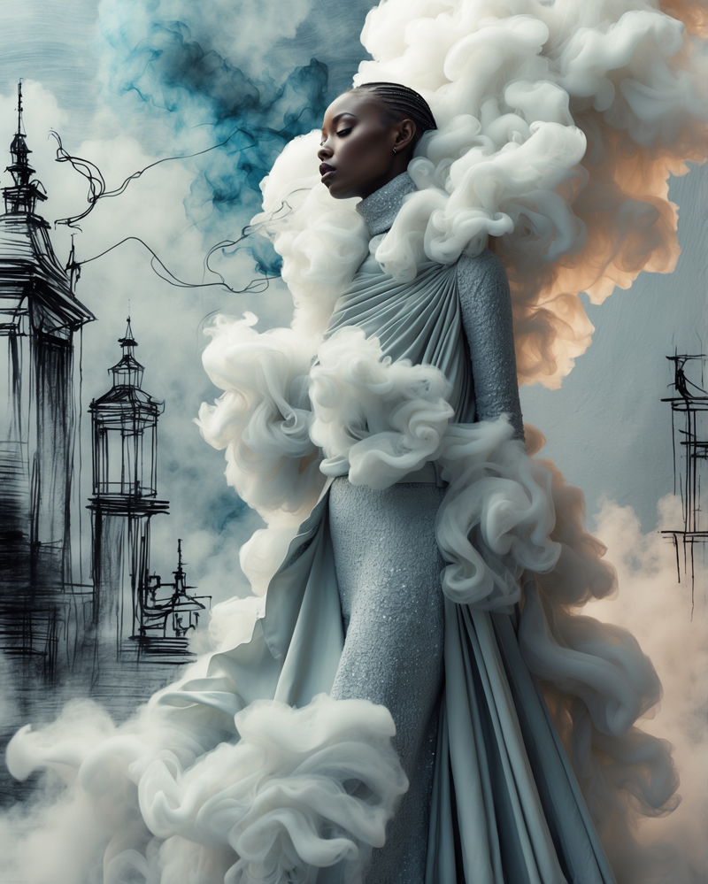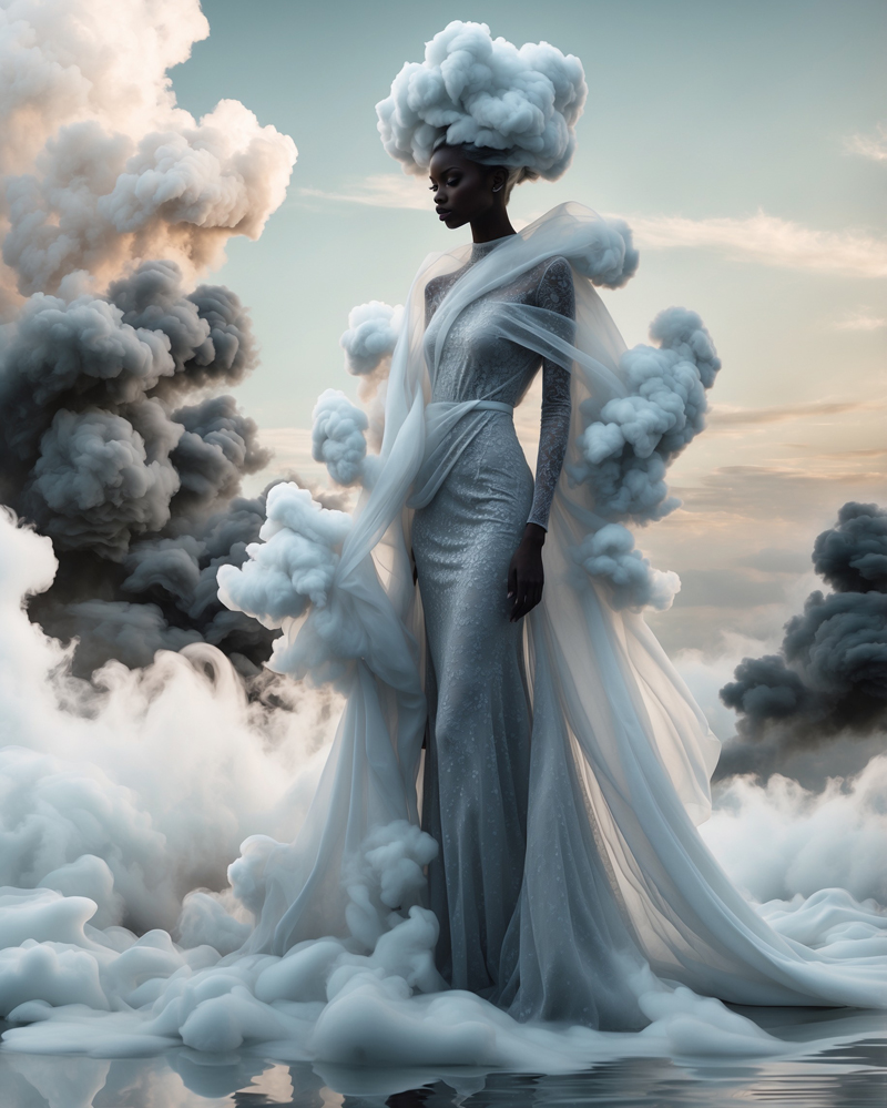„Diese Serie erforscht die fragile Grenze zwischen Körper und Atmosphäre. Frauen erscheinen wie wandelnde Wolkenformationen – zugleich monumental und ephemer. Sie verkörpern die Idee, dass Identität und Emotion nicht statisch sind, sondern sich ständig verändern, auflösen und neu zusammensetzen. Mode wird hier zur Wolke, zur Verdichtung des Unfassbaren.“