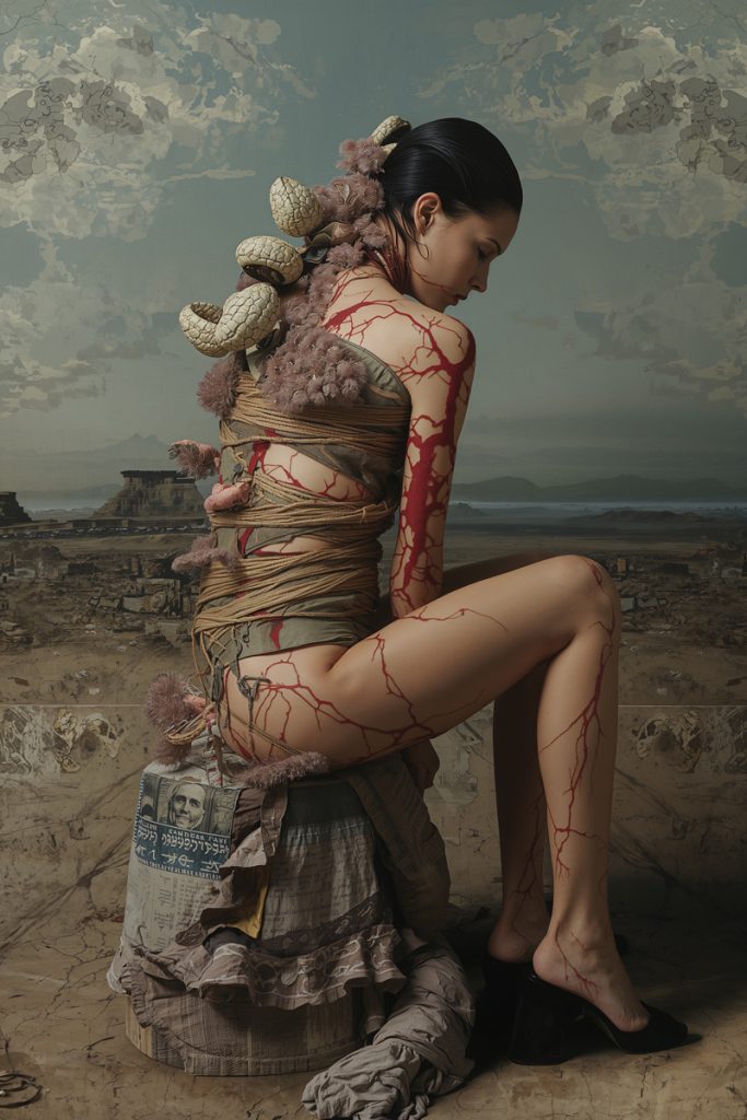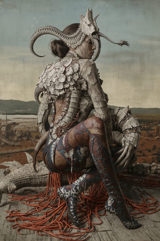 Jede Arbeit verhandelt Schönheit als etwas Konstruiertes: Eleganz entsteht nicht durch Perfektion, sondern durch Transformation. Organische Elemente verschmelzen mit geometrischen Strukturen, textile Anmut mit archaischer Symbolik. Die Körper wirken zugleich verletzlich und kraftvoll – als Wesen im Übergang.