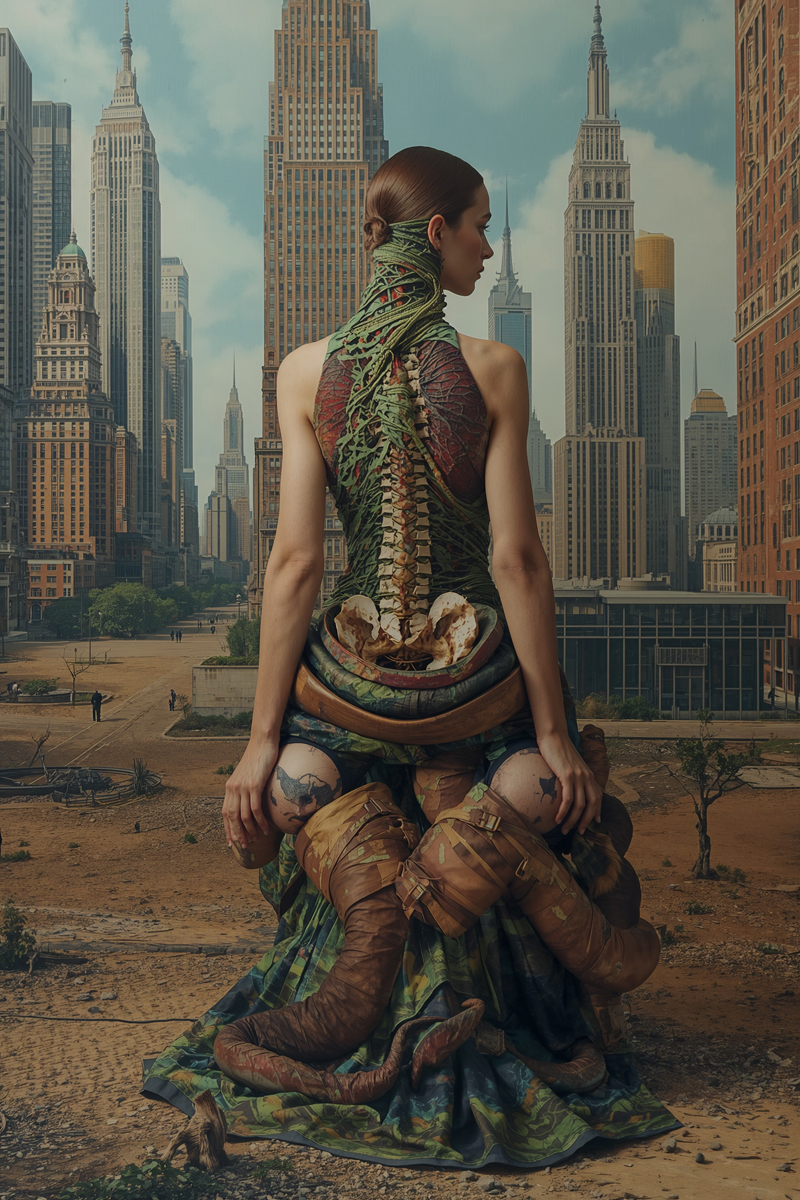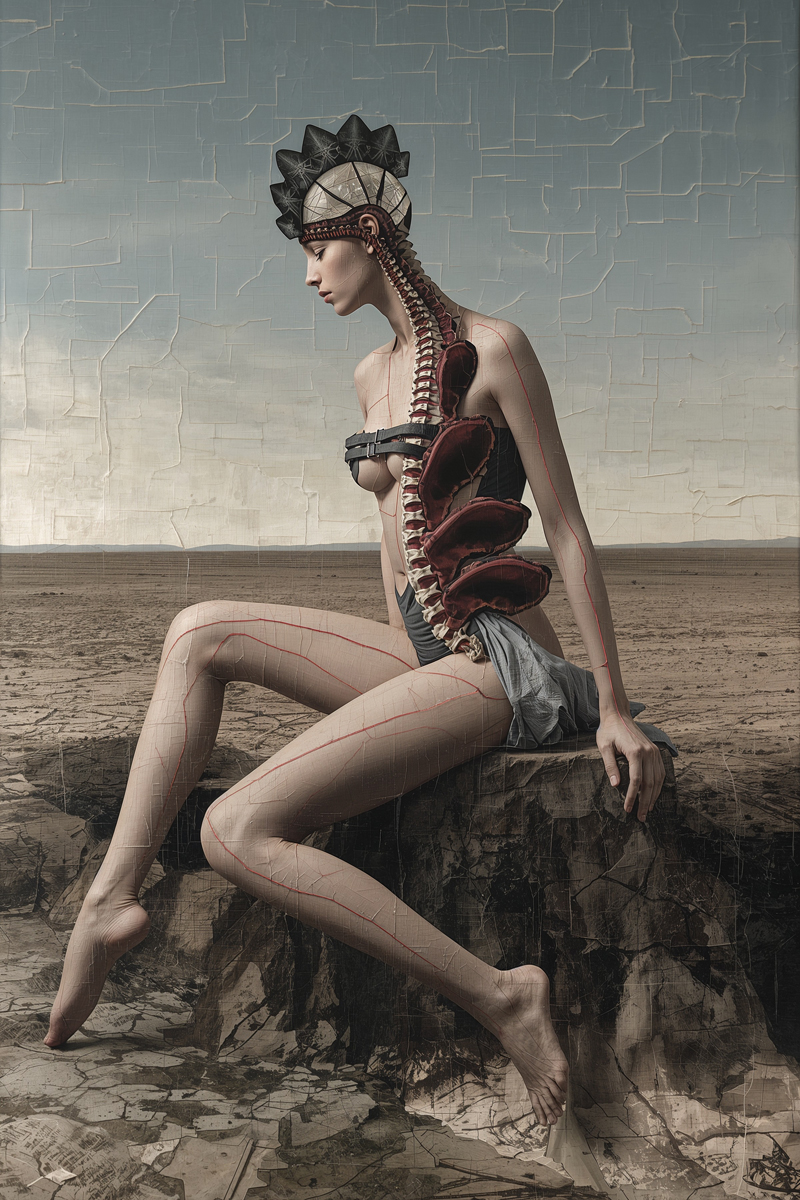Surreal Elegance – Constructed Grace erforscht den menschlichen Körper als gestaltete Form zwischen Natur, Mode und Imagination. Die Figuren erscheinen wie lebendige Skulpturen – fragmentiert, erweitert oder neu zusammengesetzt – und bewegen sich durch surrealisierte Landschaften aus Architektur, Wüste, urbanem Raum und floraler Wildnis.