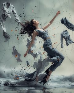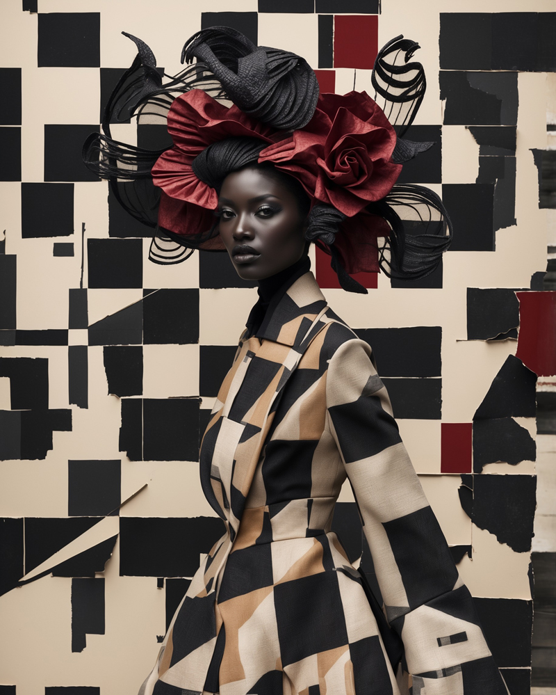Mode wird in dieser Serie zur geometrischen Choreografie: ein Zusammenspiel aus Schachbrettmustern, Spiralen und Blüten, das den Körper dekonstruiert und gleichzeitig neu inszeniert. Zwischen Couture und Kubismus entsteht ein visuelles Schachspiel, bei dem jede Figur zum Kunstwerk wird.“