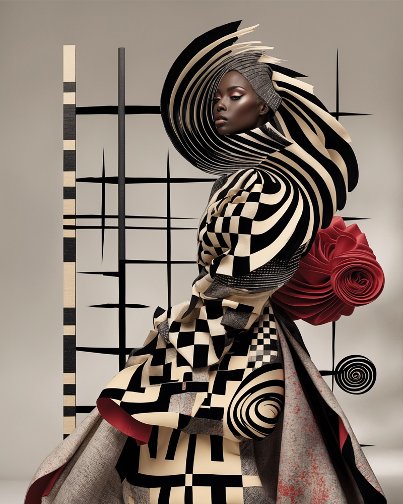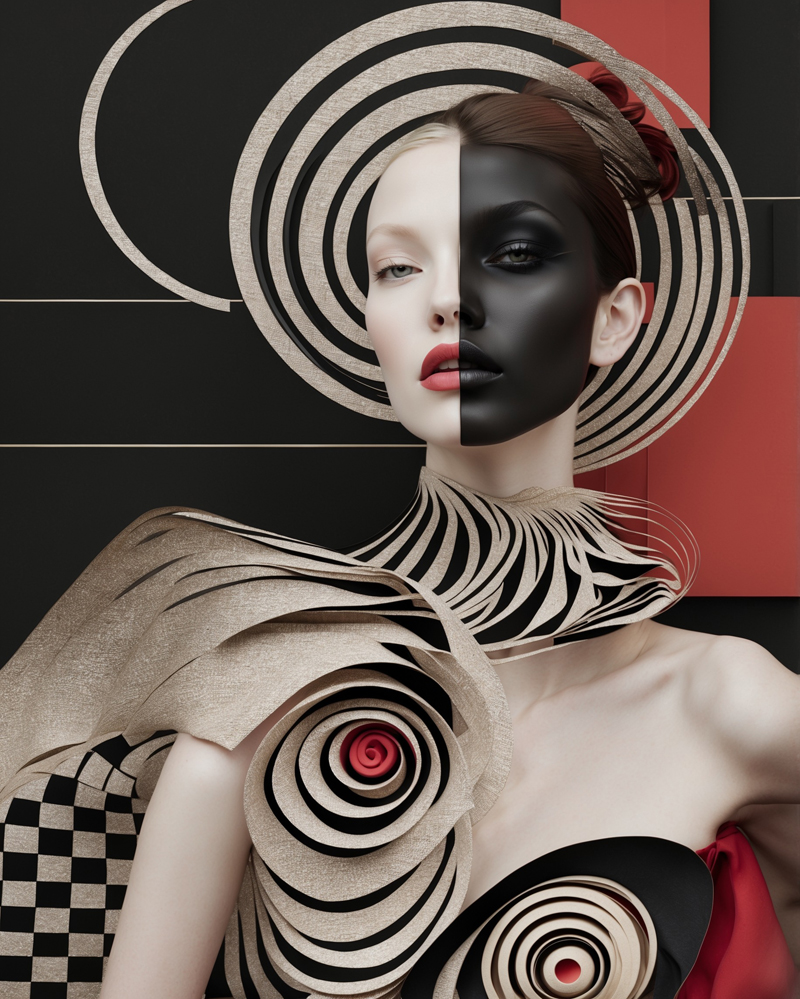 Die Bildserie ist eine künstlerische Fusion von Mode und geometrischer Abstraktion. Die Körper der Modelle werden zu Leinwänden für Schachbrettmuster, Spiralen und modulare Flächen, die an kubistische Malerei und Op-Art erinnern. Stoffe erscheinen nicht mehr als textile Weichheit, sondern als architektonische Konstruktionen, die sich mit Raum und Muster verweben. Mode wird hier zum Spiel aus Form, Rhythmus und Irritation, das zwischen Körper und Bildfläche oszilliert.