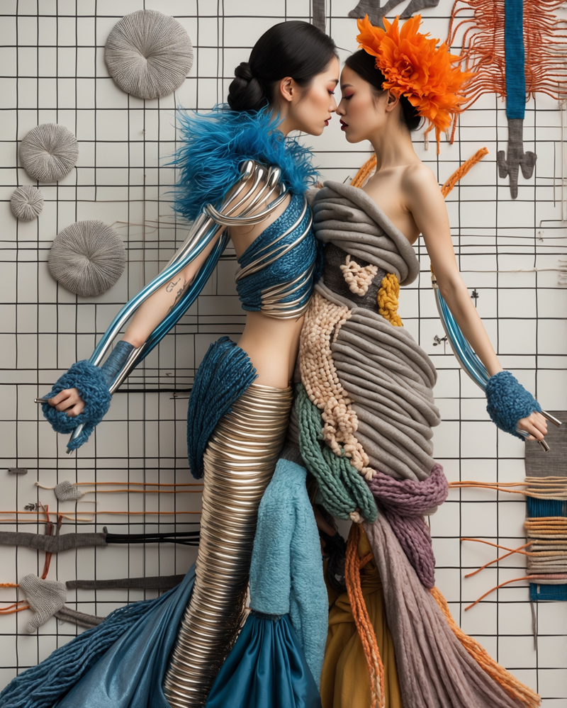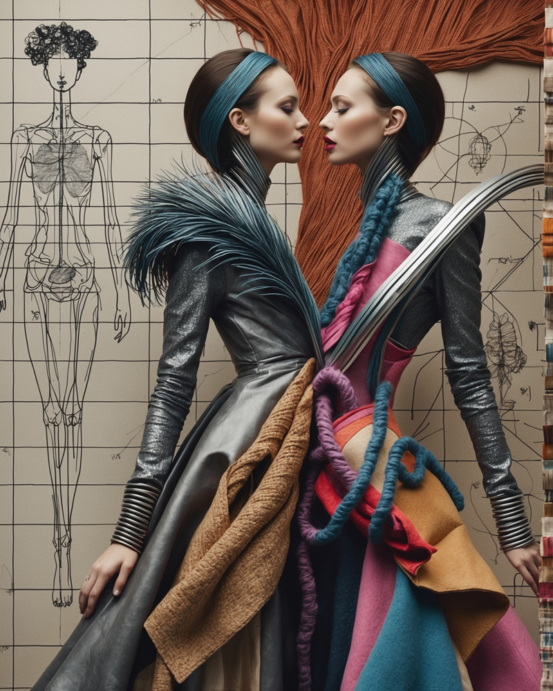 Diese Serie erforscht die Beziehung zwischen Mode, Körper und zwischenmenschlicher Verbindung. Die Figuren erscheinen nicht als isolierte Einzelwesen, sondern treten in Resonanz zueinander – wie Spiegel, wie Gegenspieler, wie Zwillingsseelen. Ihre Gewänder verschmelzen zu organischen Skulpturen aus Geflecht, Faser und Linie. Hinter ihnen scheinen Zeichnungen, Skizzen und Konstruktionen auf, die den kreativen Ursprung der Modewelt zitieren: Atelier, Entwurf, Schnittmuster. So verbindet die Serie Vergangenheit und Zukunft, Skizze und Vollendung, Körper und Vision.