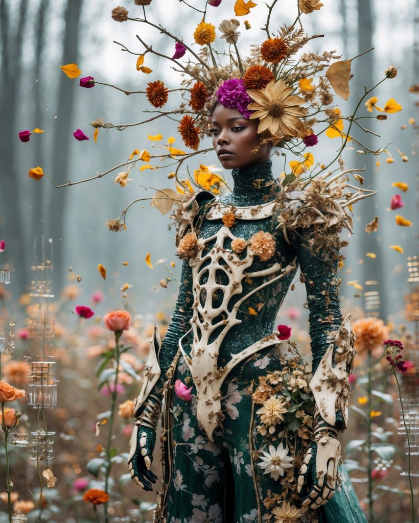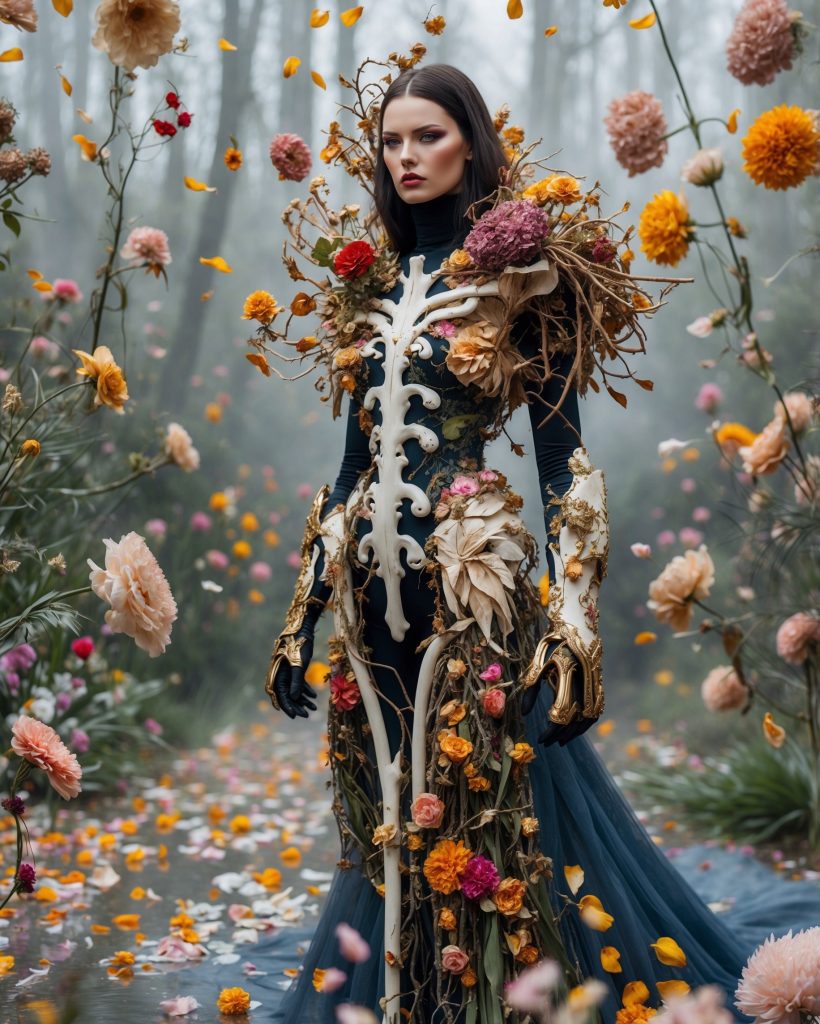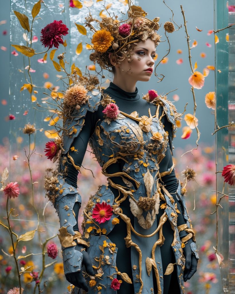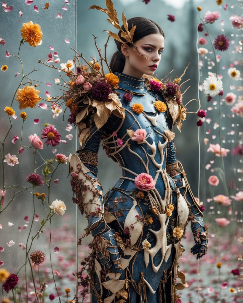 In einer Welt zwischen Traum und Natur, zwischen zarter Blüte und hartem Panzer, erhebt sich die Gestalt der „Floralen Rüstung“. Diese Serie ist eine Hommage an die Kraft der Widersprüche: Schönheit, die schützt. Sanftheit, die Stärke zeigt. Kleidung, die nicht nur bedeckt, sondern offenbart.