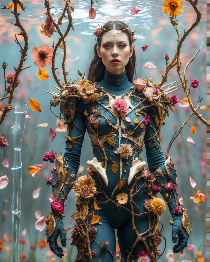 Jede Pose, jede Textur erzählt von der Symbiose zwischen Mensch und Natur. Die florale Rüstung schützt nicht vor der Natur – sie entsteht aus ihr. Und in dieser Fusion liegt eine neue Form von Eleganz: roh, träumerisch, mystisch – jenseits von Konventionen.
