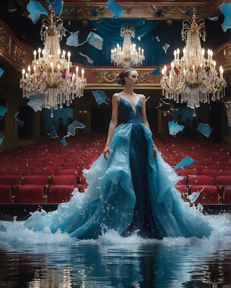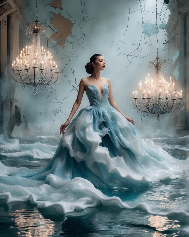 Die Bildserie inszeniert Frauenfiguren in raumgreifenden Kleidern, die an Wellen erinnern und inmitten prunkvoller, zerfallender Architektur stehen. Zwischen funkelnden Kronleuchtern, zerbrochenen Wänden und überfluteten Räumen entfaltet sich ein Spannungsfeld aus Pracht und Vergänglichkeit, Kontrolle und Chaos.