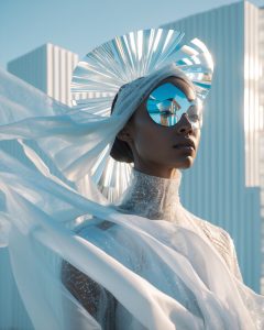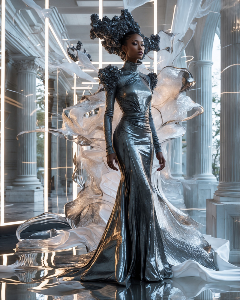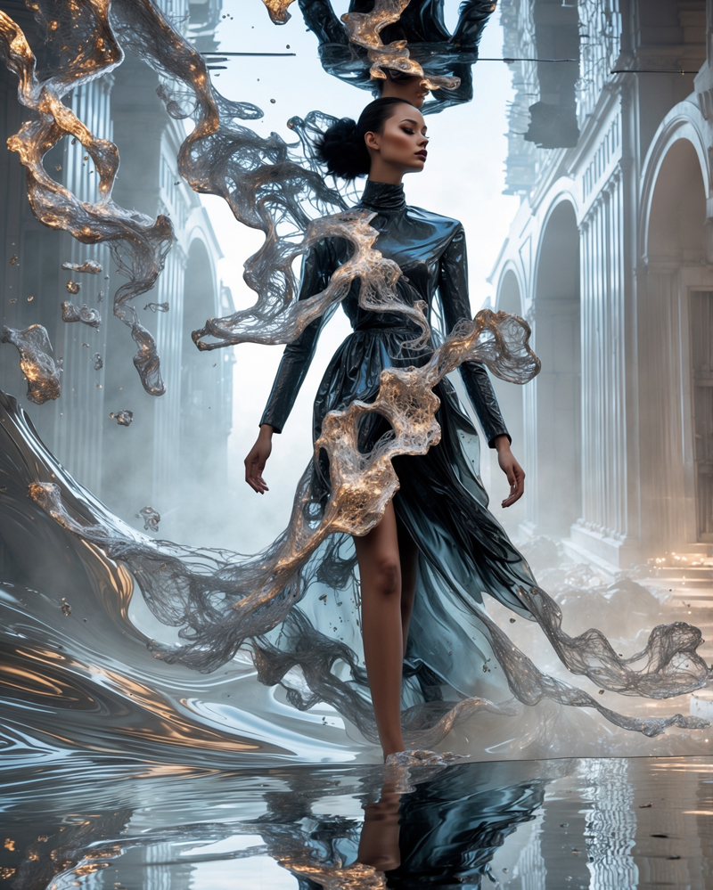 Mode als Flüssigkeit der Zukunft, geboren aus Spiegeln und Stille.