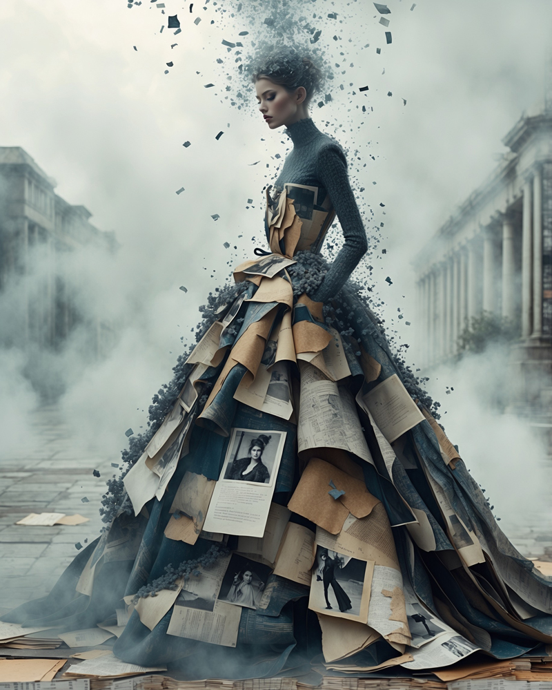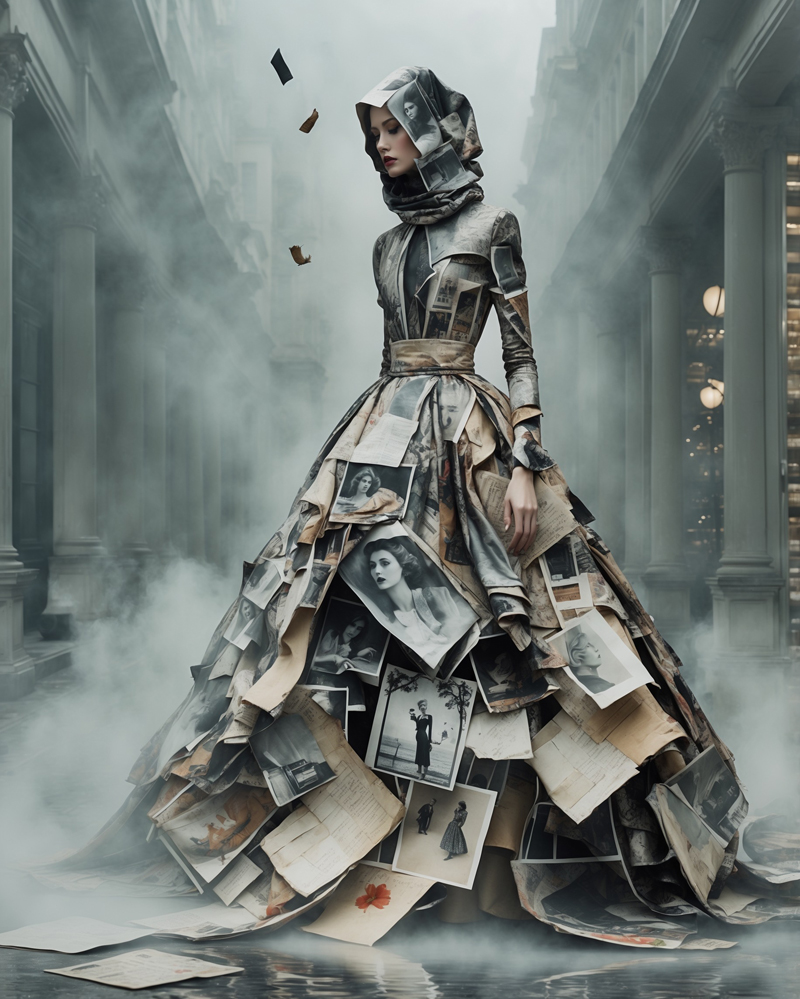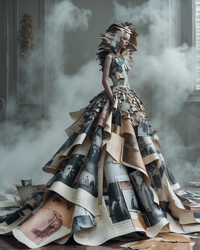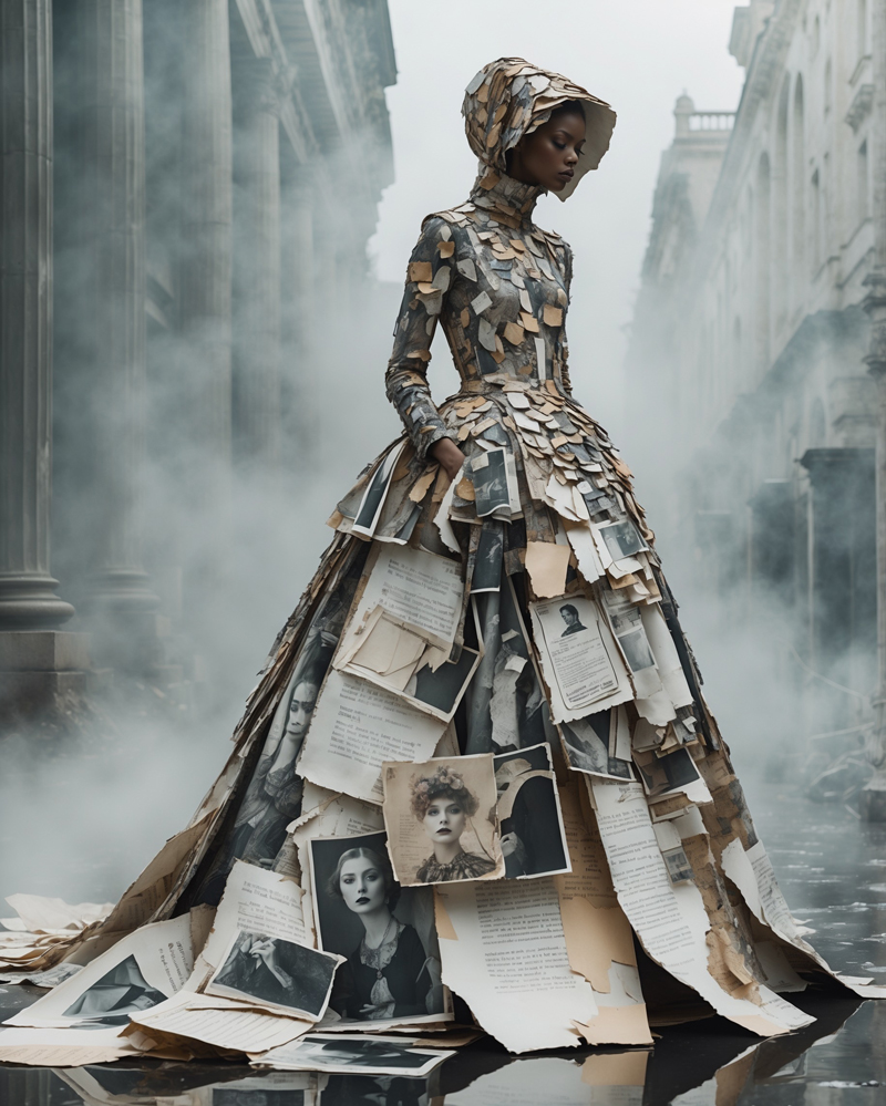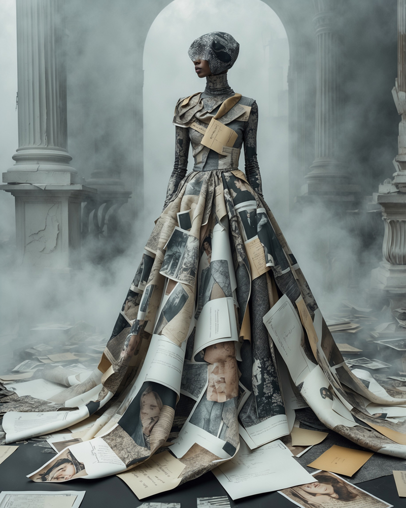 Die Gewänder bestehen aus Fragmenten – Fotografien, Seiten, Dokumente – Spuren vergangener Leben, die auf der Haut zu einer neuen Geschichte verschmelzen.