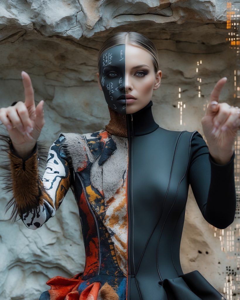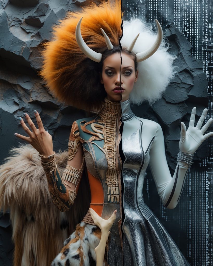 Diese Bildserie erforscht die Dualität und Hybridität menschlicher Identität im Spannungsfeld von Mythos, Mode und moderner Ästhetik. Die Inszenierungen spielen mit Gegensätzen und Verschmelzungen – animalisch und künstlich, archaisch und futuristisch, sakral und rebellisch. Kleidung, Körper und Symbolik werden zu Trägern einer universellen Frage: