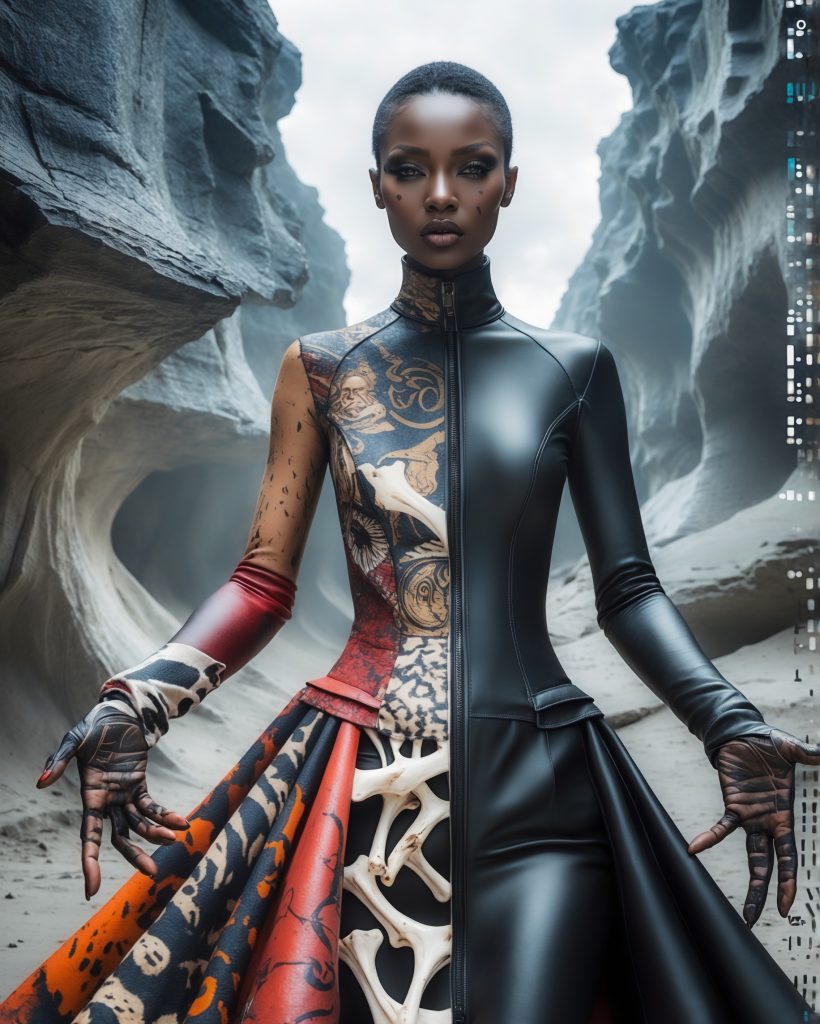 „Zwischen Ritual und Zukunft: Diese Serie verwebt Mode, Mythos und Körper zu Symbolen einer neuen Hybrid-Identität. Die Figuren oszillieren zwischen animalischer Kraft und technologischer Kühle – Ikonen eines Zeitalters der Gegensätze.“