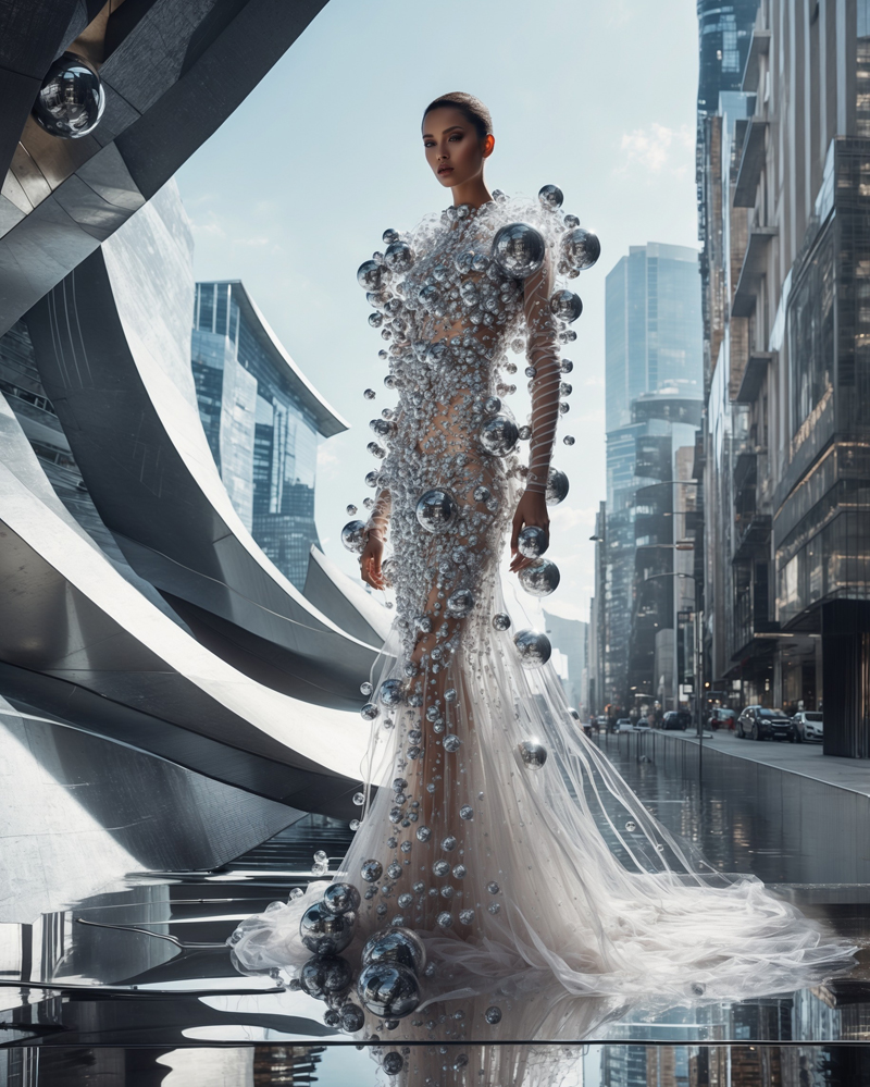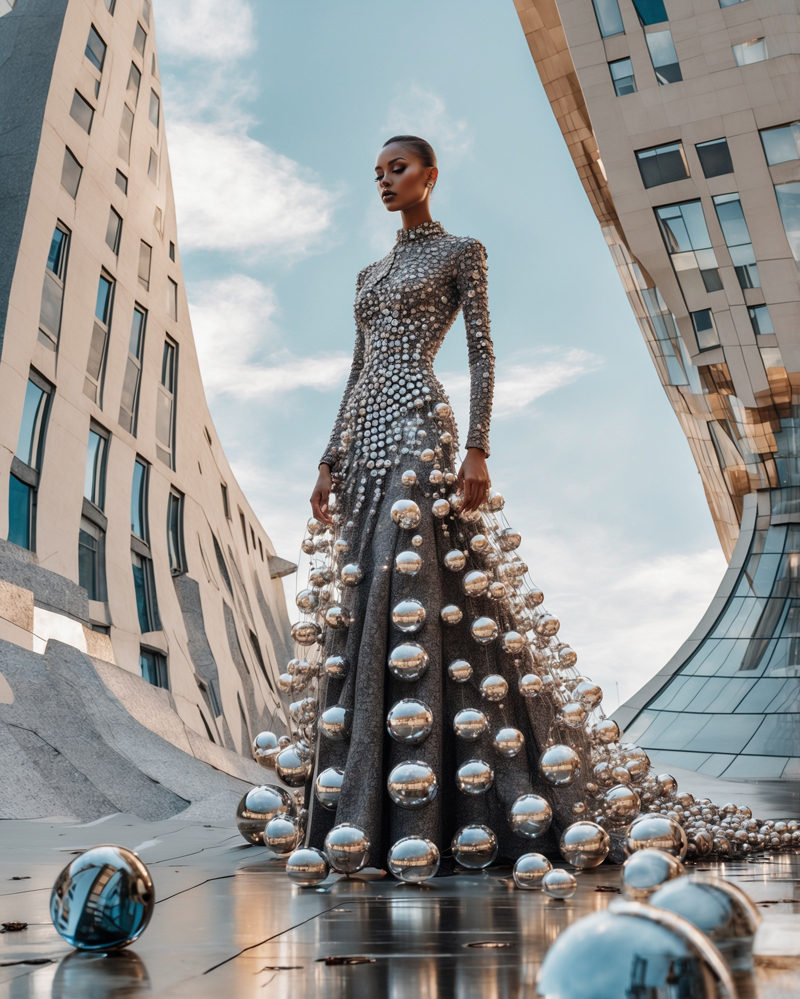 „Inmitten der Stadt erheben sich Körper wie Sternsysteme – ihre Gewänder aus Sphären sind Spiegel, Kosmos und Architektur zugleich. Mode wird hier zur Geometrie der Zukunft, zur Vision einer Menschlichkeit, die zwischen den Welten reflektiert.“