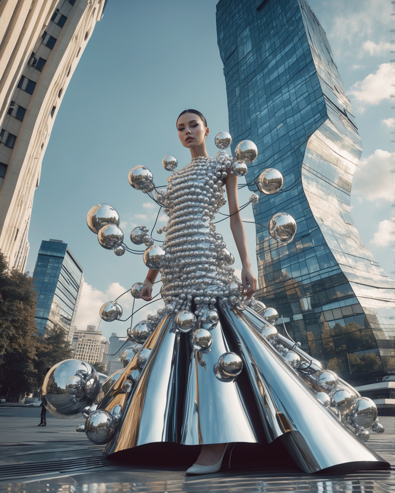 Die Bildserie inszeniert die Frau als kosmische Achse inmitten einer Stadtlandschaft aus Glas und Stahl. Die Kleider bestehen aus schimmernden Kugeln und metallischen Strukturen, die wie molekulare Konstruktionen oder Planetenbahnen wirken. Zwischen Reflexion und Transparenz entsteht ein Spiel aus Unendlichkeit, in dem Körper, Mode und Architektur ineinanderfließen.