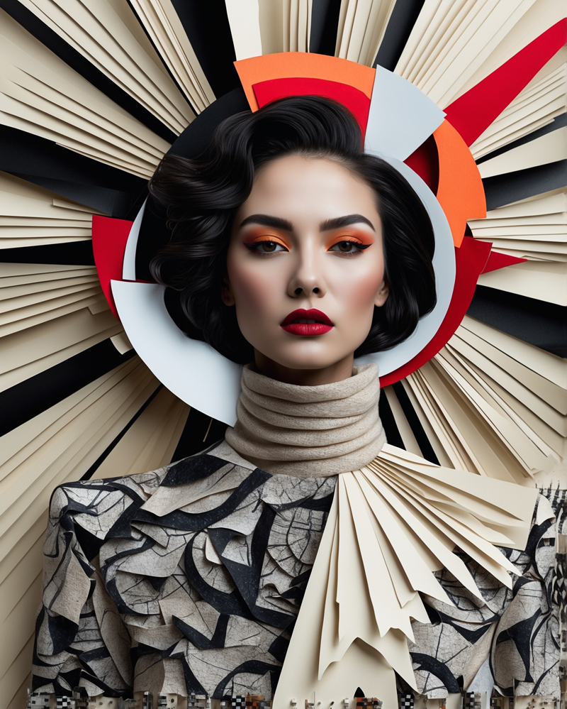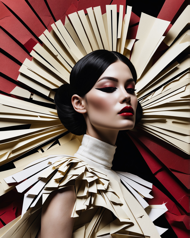 Diese Serie transformiert die Sprache des Stoffes in eine Architektur der Falten, Schnitte und radikalen Formen. Wie gefaltete Papierkunst entfalten sich die Silhouetten zu strengen und doch poetischen Skulpturen, in denen Mode nicht mehr Bekleidung, sondern Manifest wird. Die strahlenden Kompositionen aus Schwarz, Rot, Beige und geometrischen Linien erinnern an Avantgarde-Malerei, Theatermasken und futuristische Kostüme zugleich.