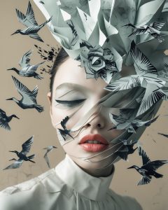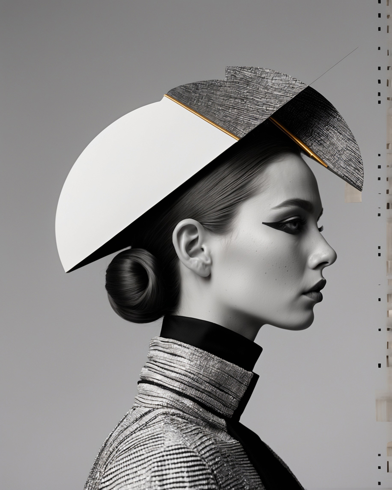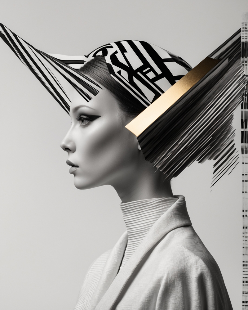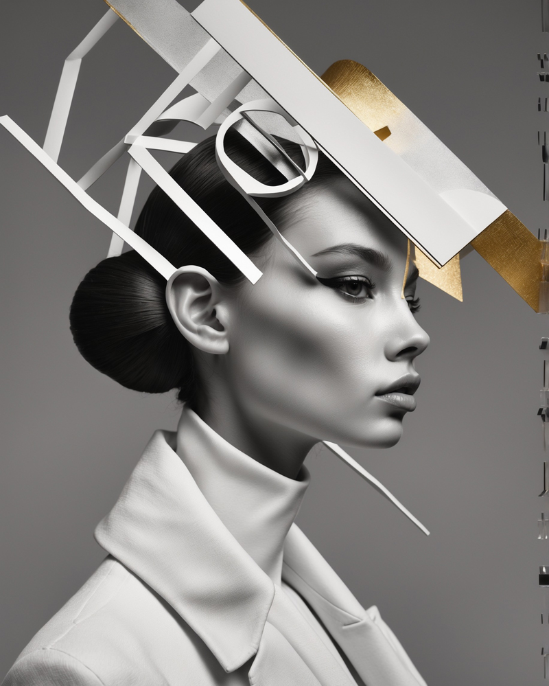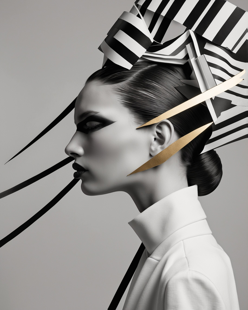 Diese Bildserie erforscht die Schnittstelle zwischen Mode, Architektur und Bildhauerei. Strenge Profile, klare Linien und geometrische Kopfbauten verschmelzen zu skulpturalen Silhouetten. Der Einsatz von Schwarz, Weiß und Gold erzeugt einen Rhythmus von Strenge und Raffinesse, von Reduktion und kostbarer Akzentuierung.