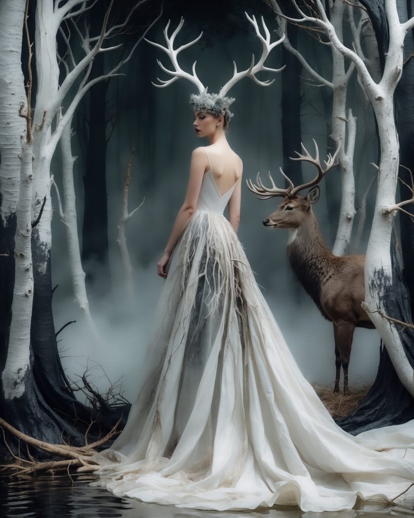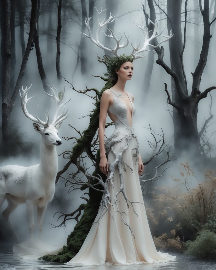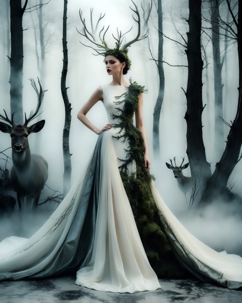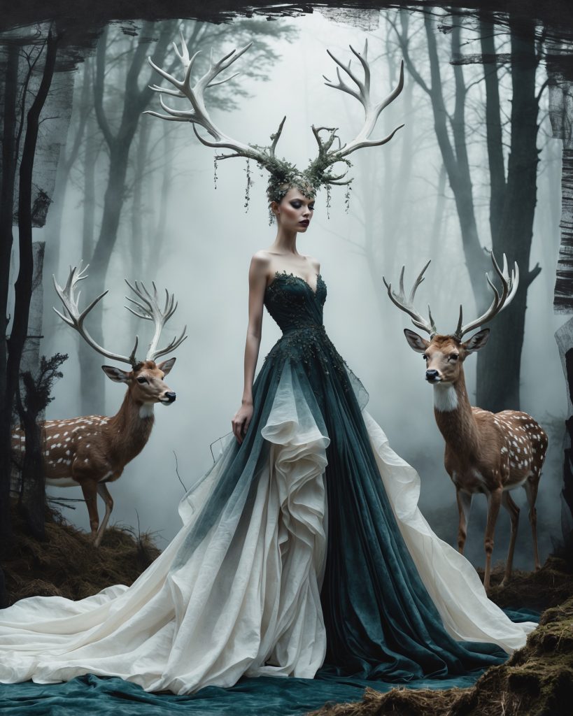 In dieser Serie verschmilzt Mode, Mythos und Natur zu einer poetischen Vision zwischen Realität und Fabel. Die Models erscheinen wie Waldgöttinnen, geerdet und doch entrückt, deren Gewänder mit den Texturen des Waldes verschmelzen. Geweihe wachsen wie natürliche Kronen aus ihrem Haupt, und an ihrer Seite schreiten majestätische Hirsche – Sinnbilder für Anmut, Würde und Wildheit. Das Setting in einem nebelverhangenen Wald erschafft eine mystische Bühne, auf der Mode nicht nur getragen, sondern gelebt wird – als Brücke zwischen der irdischen und der spirituellen Welt.