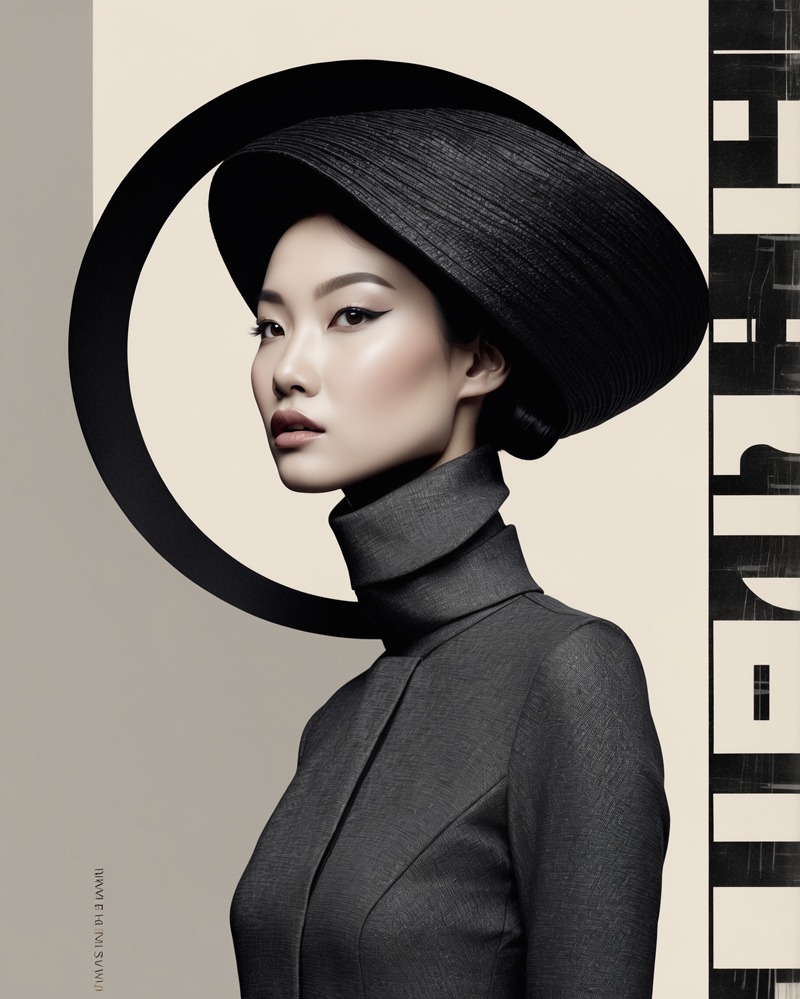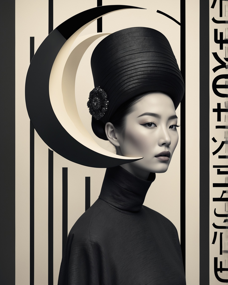 Diese Bildreihe ist eine Hommage an die Geometrie der Moderne und die archaische Symbolik des Mondes. Zwischen Bauhaus-Strenge und fernöstlicher Typografie entsteht ein zeitloser Dialog: weibliche Porträts als stille Monumente, die von Kreisen, Monden und Linien umrahmt werden. Das Grafische trifft auf das Skulpturale, das Modische auf das Spirituelle.