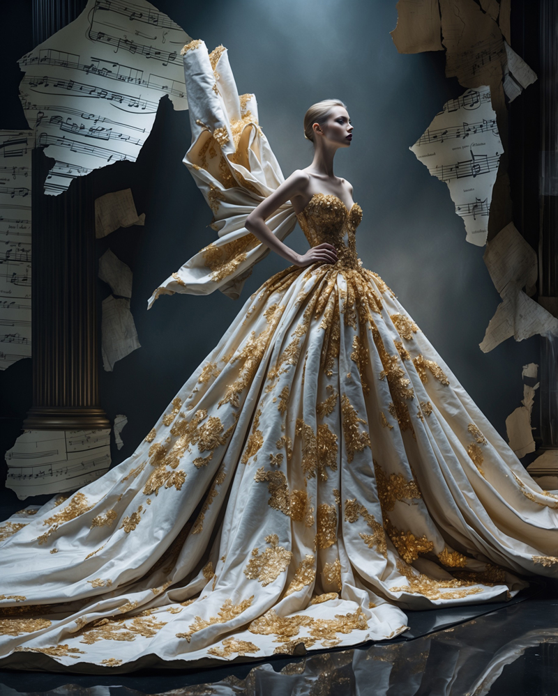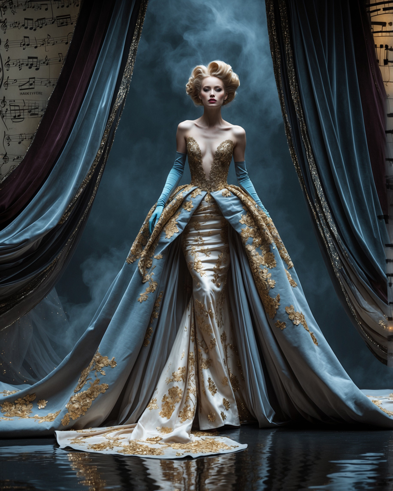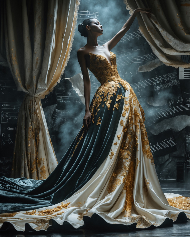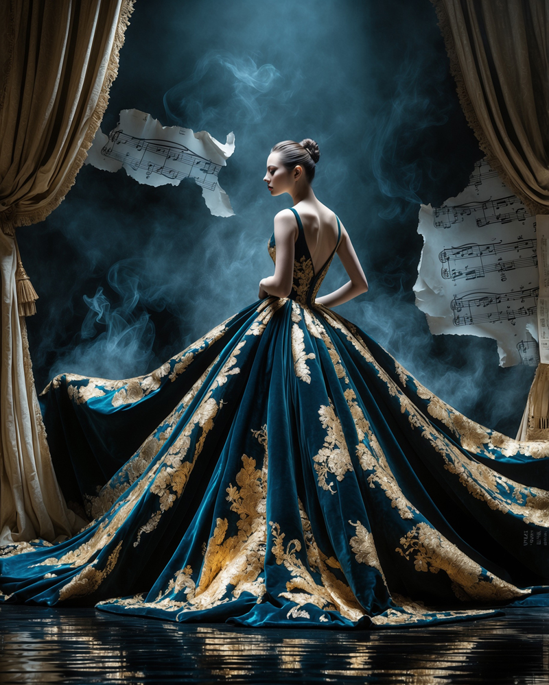 Die Serie verwandelt Mode in eine visuelle Partitur. Goldene Brokate, schwere Vorhänge und aufgerissene Notenblätter verbinden Couture mit Opernkulisse und lassen die Figuren wie personifizierte Musik erscheinen – zwischen Tragödie und Triumph.