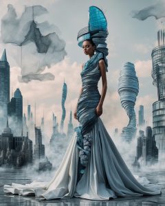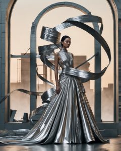 Diese Bildserie erforscht die Verschmelzung von Mode und Musik. Die Kleider erscheinen wie klingende Partituren, in denen Stoff, Bewegung und Raum zu einer visuellen Symphonie verschmelzen.